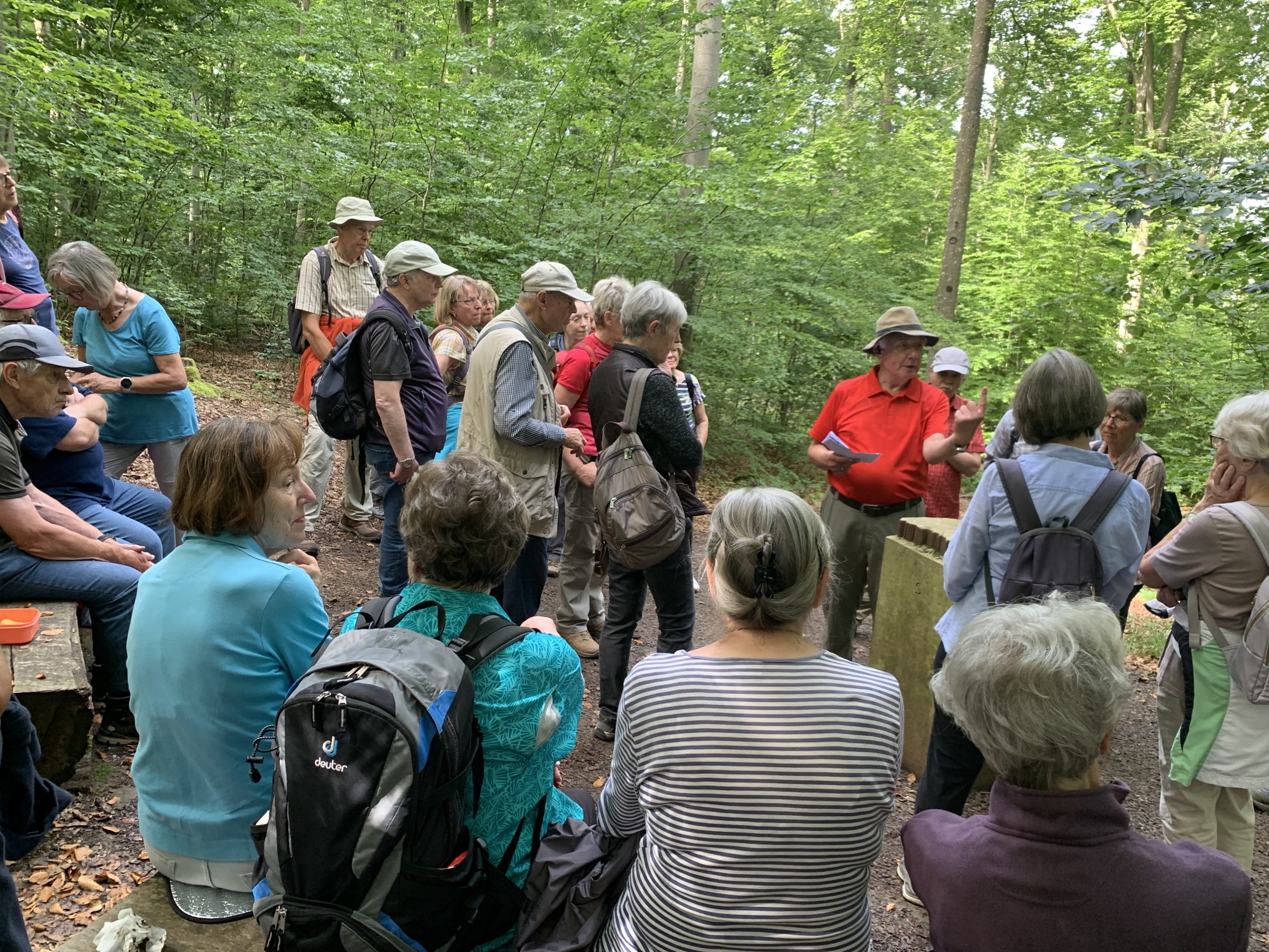 In Lorch-Waldhausen, wo der Mittelpunkt der Rems liegt, starteten 17 Wanderinnen und Wanderer ihre Tour, um dem RemstalWeg 14 km bis nach Schorndorf zu folgen. Der Remstalweg wurde anlässlich der Landesgartenschau im Jahr 2019 in Kooperation des Schwäbischen Albvereins mit dem Tourismusverein des Remstals eingerichtet. Er führt nicht direkt entlang der Rems, sondern unsere Etappe verlief auf halber Höhe durch die Waldgebiete Remshalde und Berkener Wand. Nach einem Blick auf die Elisabethenhöhe bei Waldhausen, auf der zu staufischer Zeit die Burg Waldhausen stand, ging es gleich bergauf bis zum RemstalWeg. Nach einer Stunde erreichten wir die Rehhaldenhütte, ein idyllisch gelegener Flecken auf einer kleinen Waldlichtung. Der Hüttenwart des Albvereins Plüderhausen hatte die Hütte eigens für uns geöffnet und servierte uns kühle Getränke, die wir an diesem reichlich heißen Tag dankbar genossen. Die Berkerwandhütte, die wir nach einer weiteren Stunde auf ansteigendem Weg erreichten, bot dagegen zu unserer Enttäuschung keine Gelegenheit sich niederzulassen, da die Sitzbänke an der geschlossenen Schutzhütte von Vögeln völlig verschmutzt waren. Bald danach ging es jedoch bergab nach Schorndorf, wo wir nach einer Schleife durch das historische Stadtzentrum vorbei am Geburtshaus von Gottlieb Daimler in der Gasthausbrauerei Kesselhaus das verdiente Vesper einnehmen konnten. Auch die Geschichte der Weiber von Schorndorf unter Führung von Barbara Künkelin wurde natürlich gewürdigt. Zum guten Schluss soll das seltene Erlebnis nicht unerwähnt bleiben, dass Hin- und Rückfahrt mit der Deutschen Bahn absolut pünktlich und störungsfrei erfolgten.