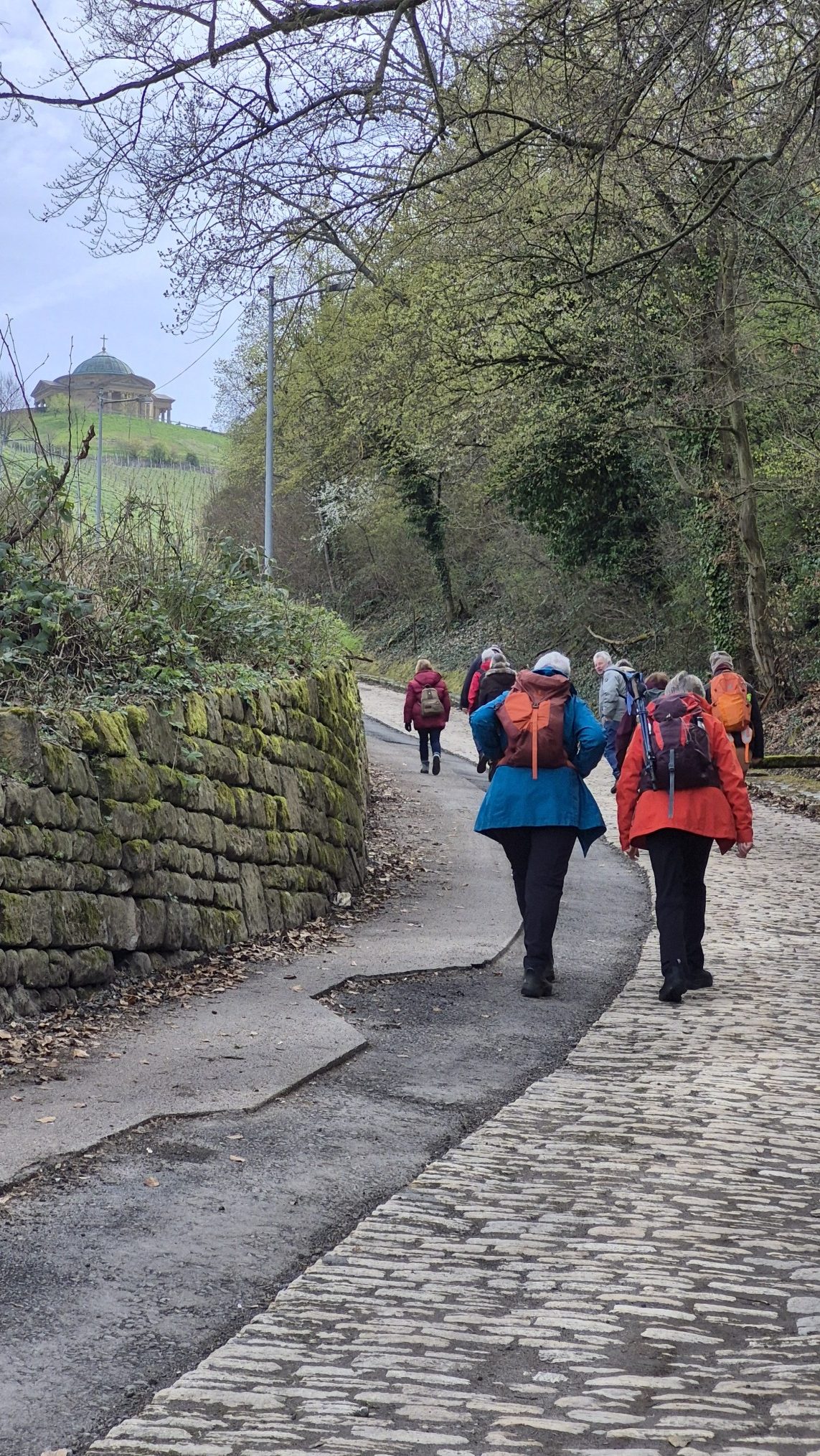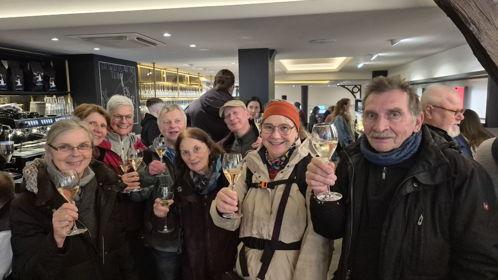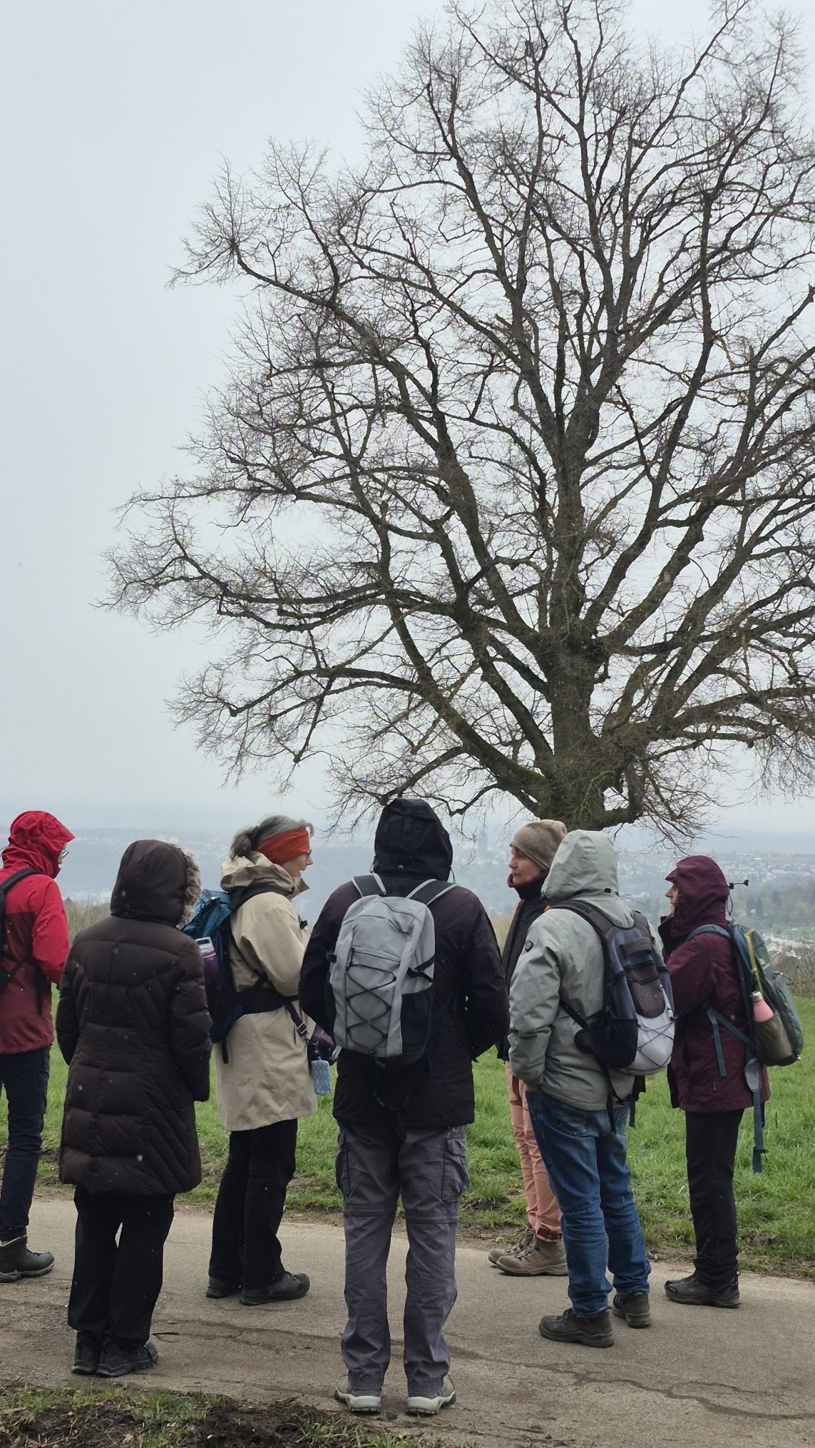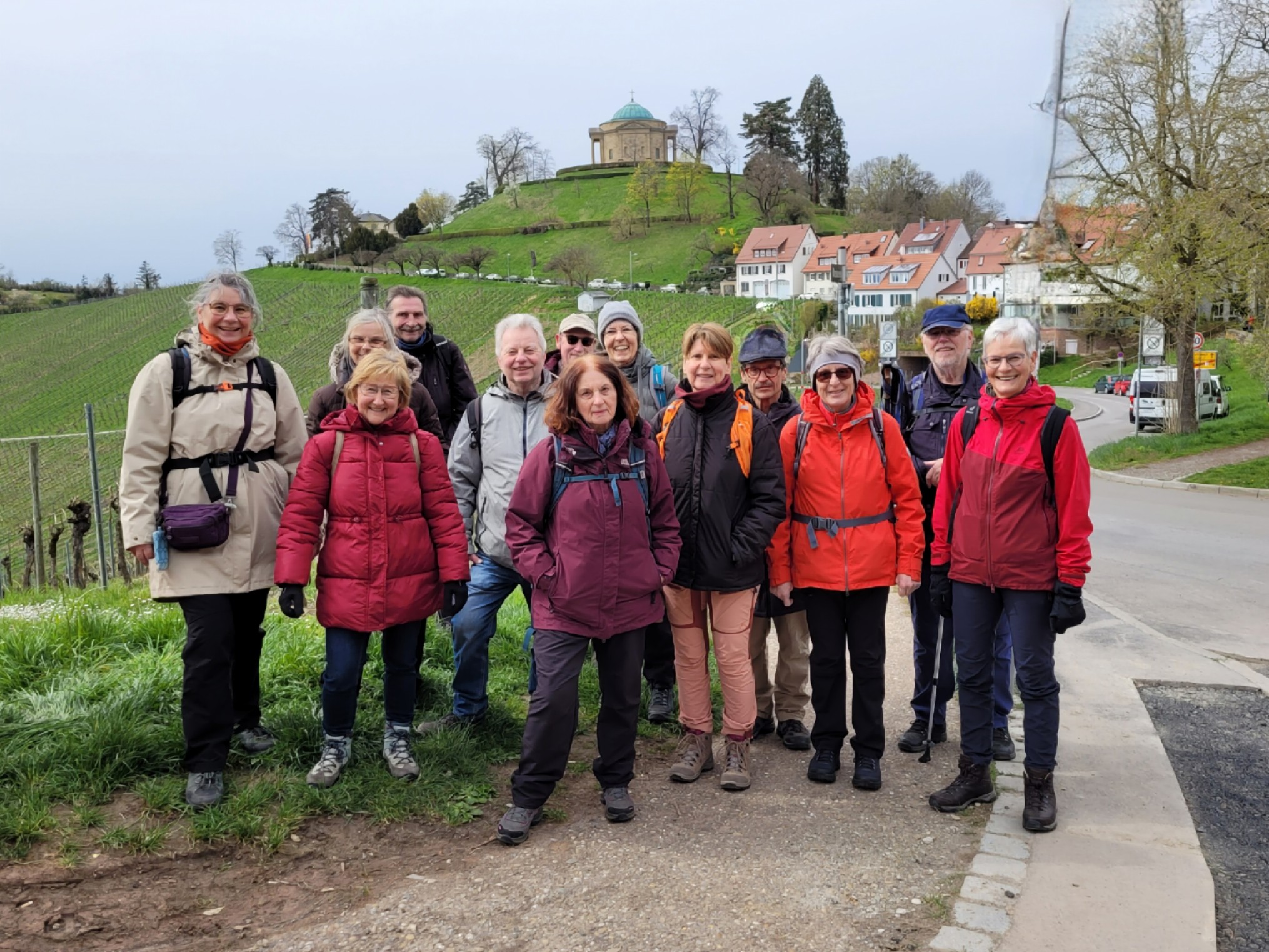 Von Untertürkheim stieg die Gruppe zur Grabkapelle auf dem Rotenberg bzw. Württemberg auf und genoss die Sicht über das Neckartal. Die berühmte russisch-orthodoxe Grabkapelle, in der das vom württembergischen Volk verehrte Königspaar Katharina I. und Wilhelm I. von Württemberg ruhen, bot wegen ihrer Geschichtsträchtigkeit Anlass zu einem spaßmachenden Quiz. Die Teilnehmerinnen und Teilnehmer waren heimatkundlich sehr gut informiert, so dass sich die von der Wanderführerin als Gewinn mitgebrachten Toffees rasch reduzierten. Von Rotenberg wanderte die Gruppe dann hurtig durch die von Frühlingsblumen schön bunt gefärbten Weinberge zum Albvereinshaus „Katharinenlinde“ auf der Rüderner Heide, wo sie zum Mittagessen einkehrte. Die herzhaften Gerichte und durstlöschenden Getränke kamen bei einem schönen Blick auf den Albtrauf gut an. Danach passierte die Gruppe die exponiert stehende Katharinenlinde. Deren Name geht auf Katharina von Alexandrien (4. Jhdt.) zurück, um die sich verschiedene Sagen ranken. Der Weg führte von dort hinab ins Tal zur Katharinenquelle, die ebenfalls der Katharina von Alexandrien gewidmet ist. Über Wäldenbronn erreichte die Gruppe am Nachmittag bei inzwischen strömendem Regen den Innenhof der Kessler-Sektkellerei in der historischen Altstadt von Esslingen und schloss den Ausflug bei einem gediegenen Glas Sekt genüsslich in fröhlicher Runde ab.